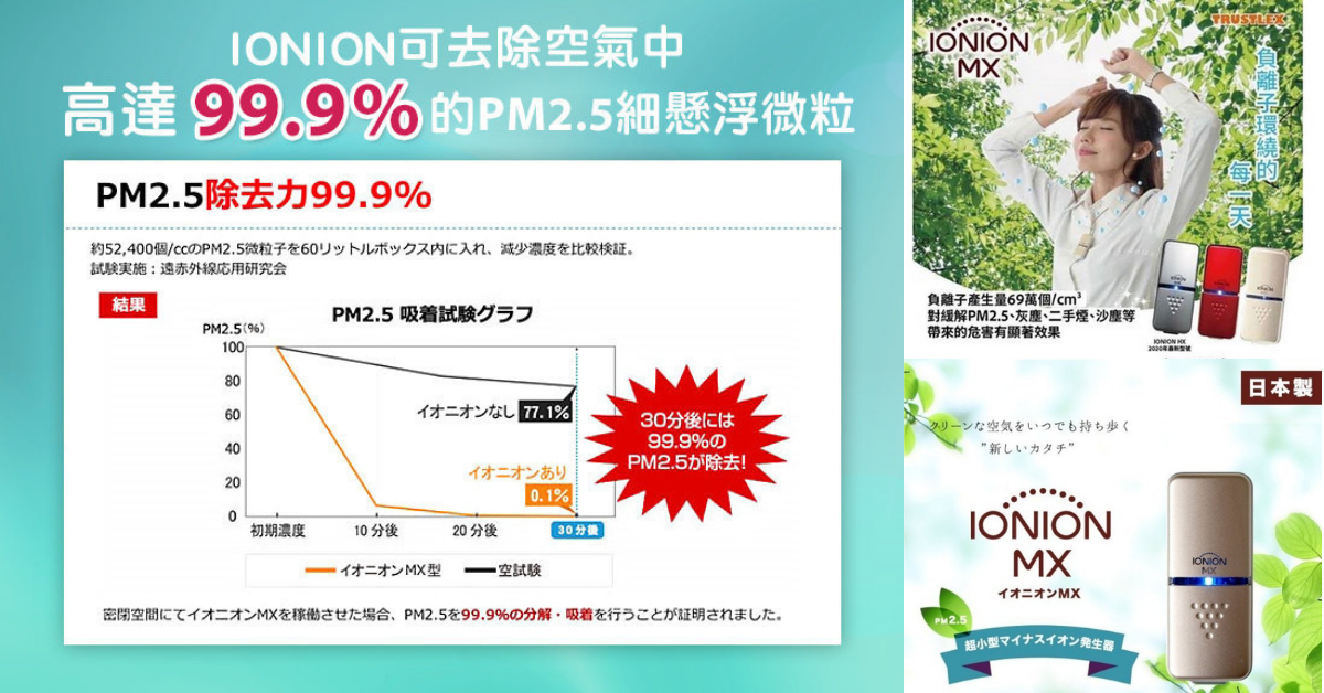 IONION MX 超輕量隨身空氣清淨機,日本製造,機身只重 20g,係世上最輕巧的空氣清新機,隨身佩戴都無負擔。IONION MX 每秒不斷產生 69 萬氧負離子,有效去除致癌懸浮微粒 PM2.5 達99.9%,去除致命污染毒物、甲醛達 94.6%,令你可以呼吸清新空氣。